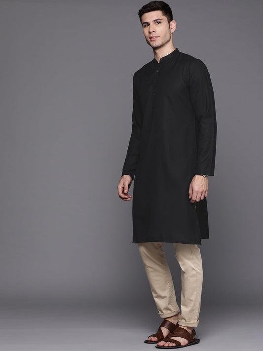Indo Era Black Textured Cotton Blend Straight Kurtas