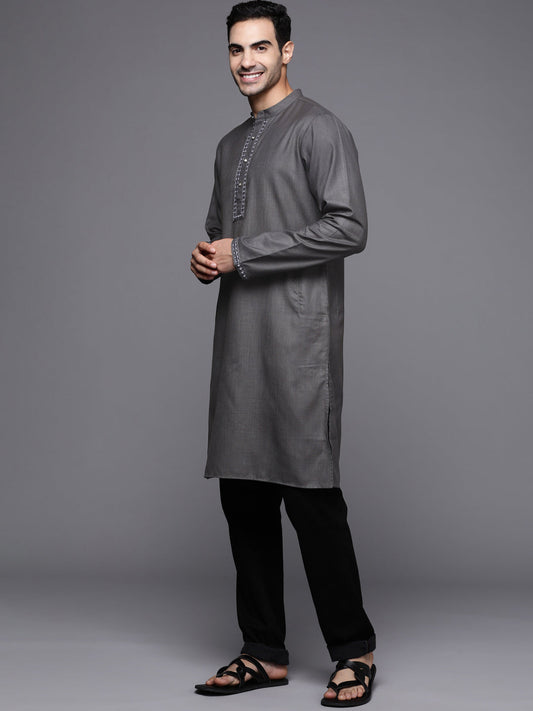 Indo Era Grey Embroidered Cotton Straight Kurtas