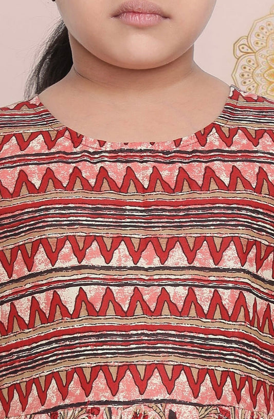 Girls Pink Ethnic Print Pure Cotton Fit & Flare Dress