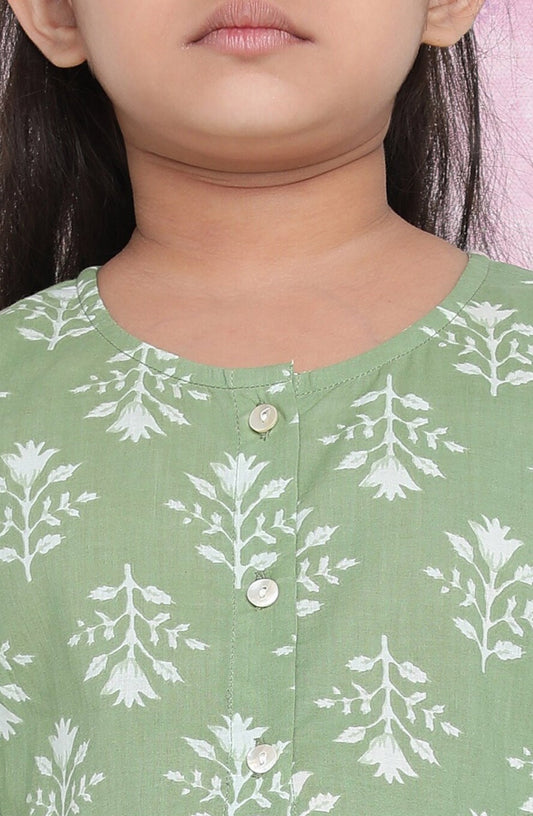 Girls Green Floral Printed Bell Sleeve Cotton A-Line Dress