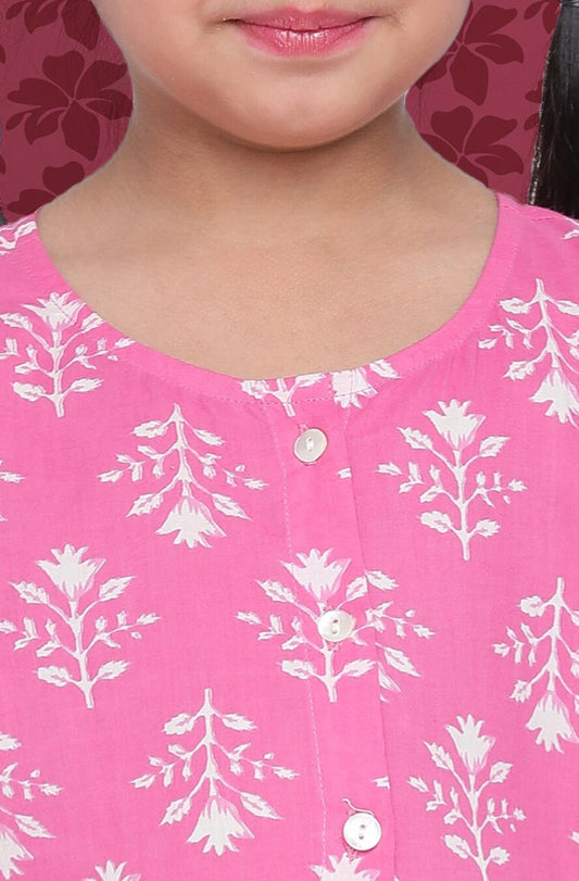 Girls Pink Floral Printed Bell Sleeve Cotton A-Line Dress