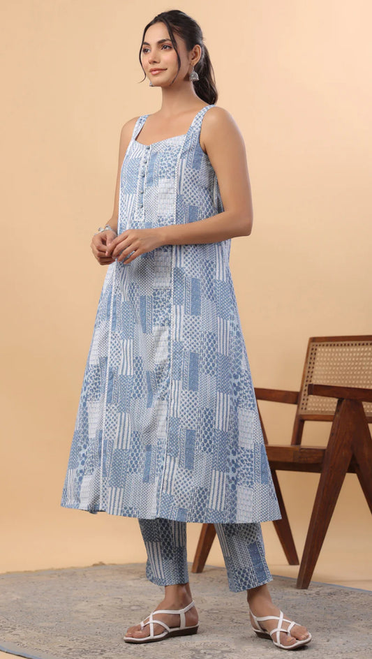 Blue Cotton Ethinc Motifs A-Line Kurta Set