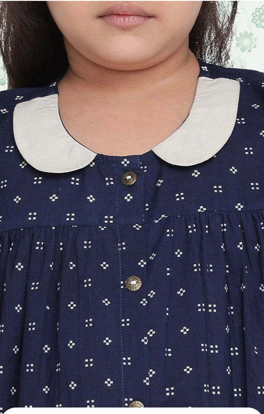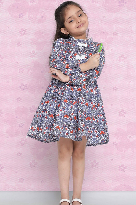 Girls Navy Blue Floral Printed Cotton A-Line Dress