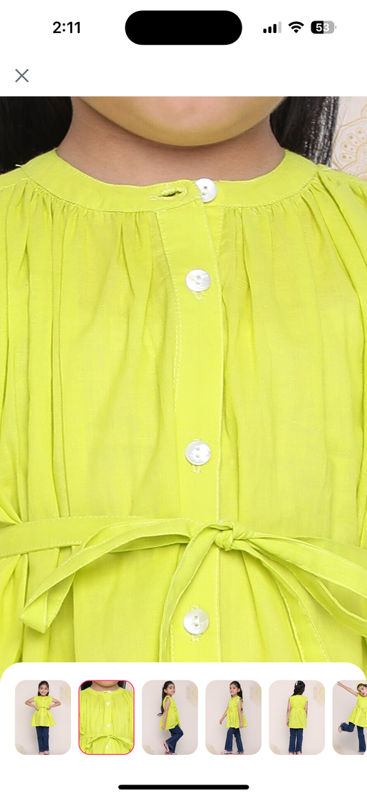 Girls Green Band Collar Extended Sleeves Cotton Top