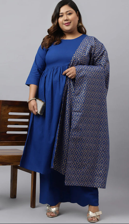 Blue Cotton Solid Kurta with Palazzo and Dupatta