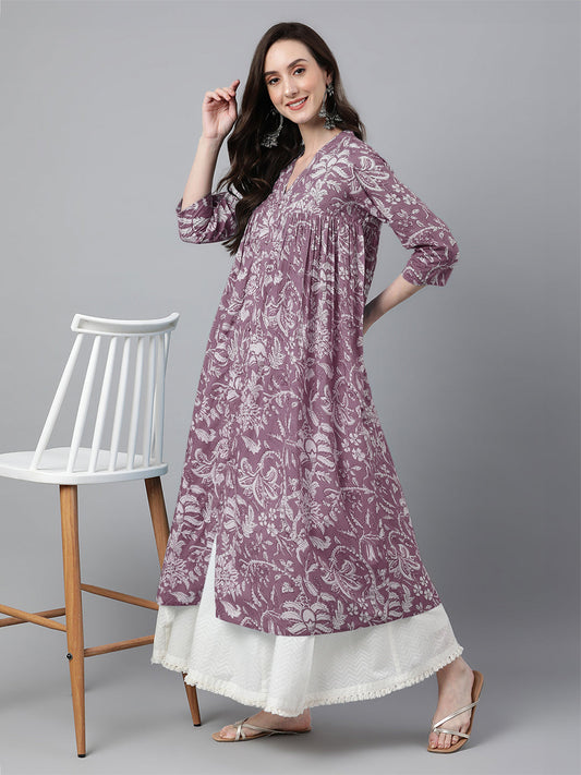 Plus Size Mauve Pure Cotton Floral Printed Gathered Dress
