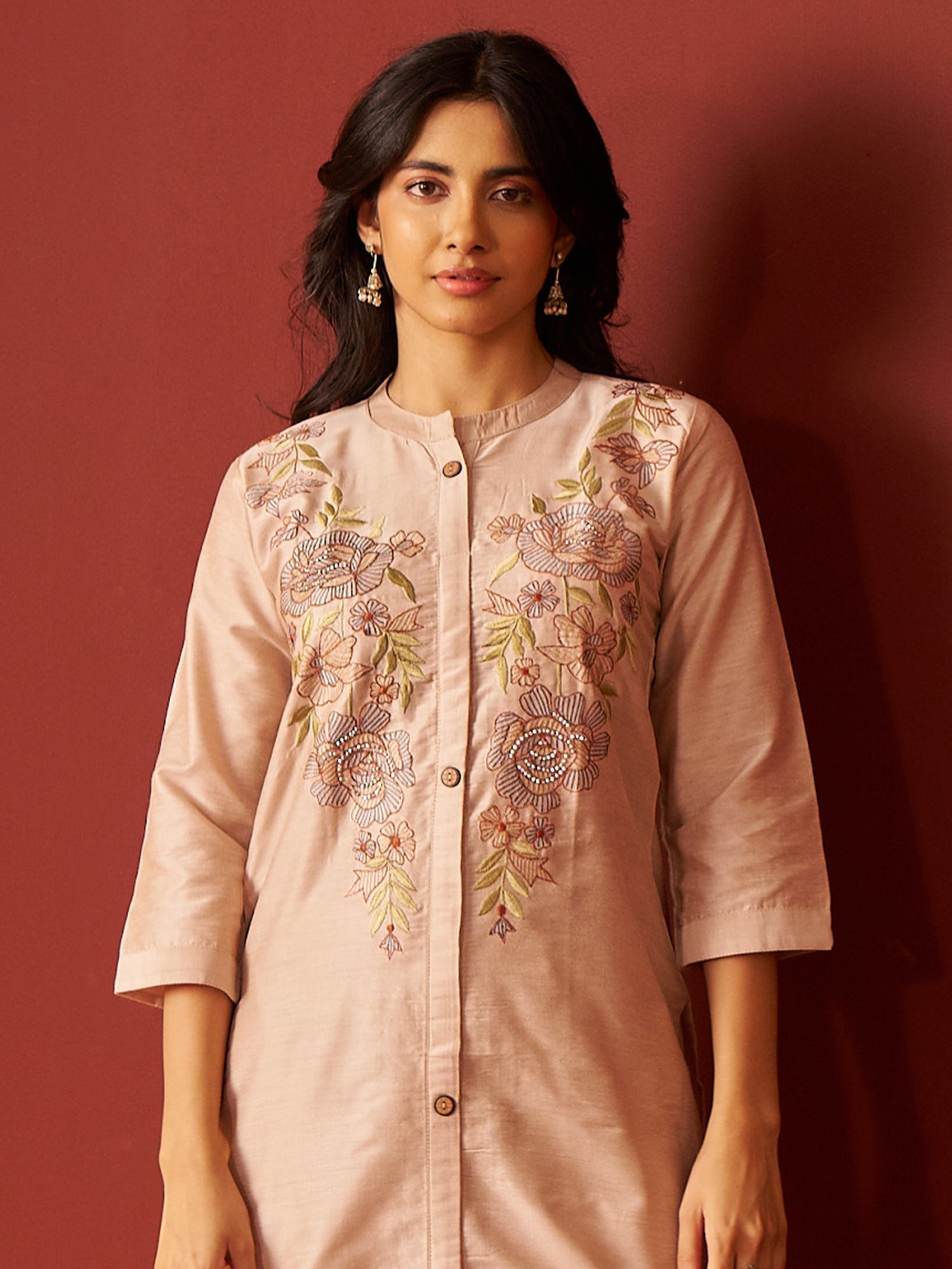 Beige Embroidered Pure Cotton Straight Women Kurta Trouser Set