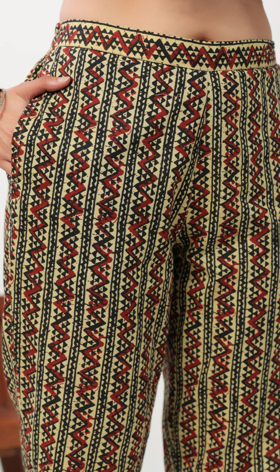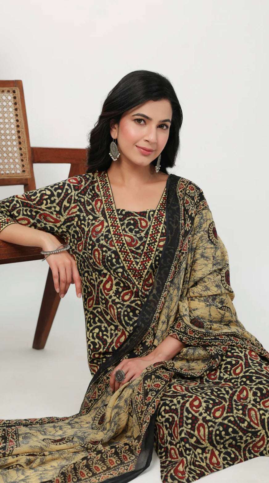 - Cotton Black Ethnic Motif Printed Kurta with Pant and Dupatta set. Crafted for comfort and style, this ensemble exudes sophistication effortlessly. The straight kurta, adorned with an ethnic motif print, features a classic V-neckline for timeless charm. Paired with narrow pants in a versatile beige hue, complete with side slits and side pockets for added functionality, this ensemble offers both style and practicality. Complementing the set is a matching printed dupatta, adding a touch of grace and completing your look with finesse. Elevate your casual wear with Janasya, perfect for embracing effortless elegance in every step.