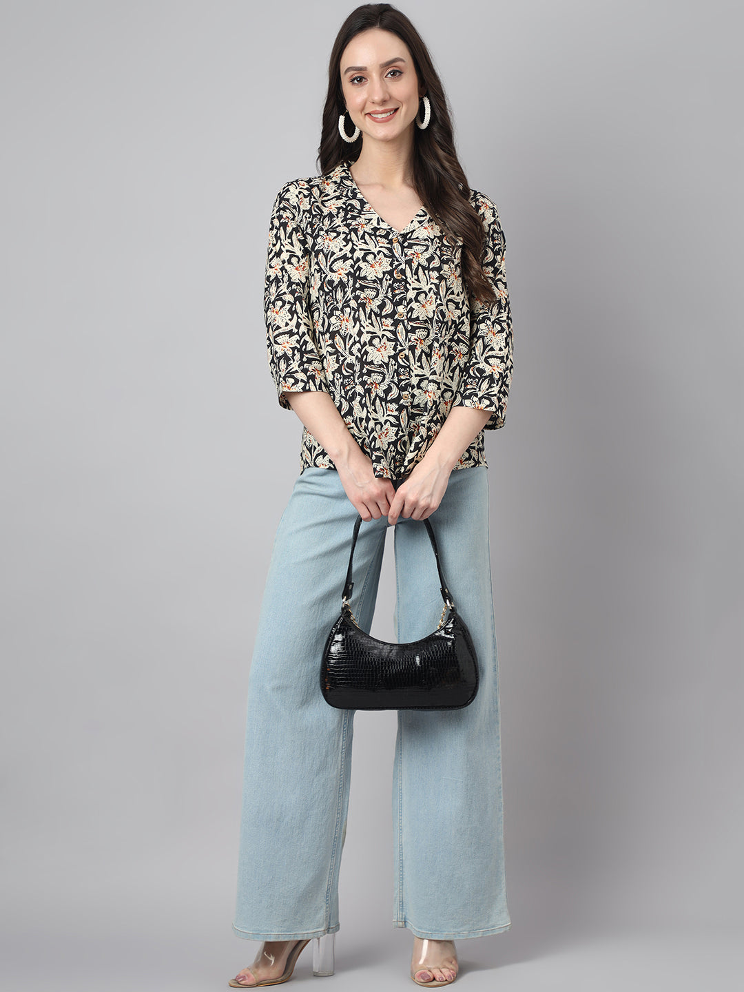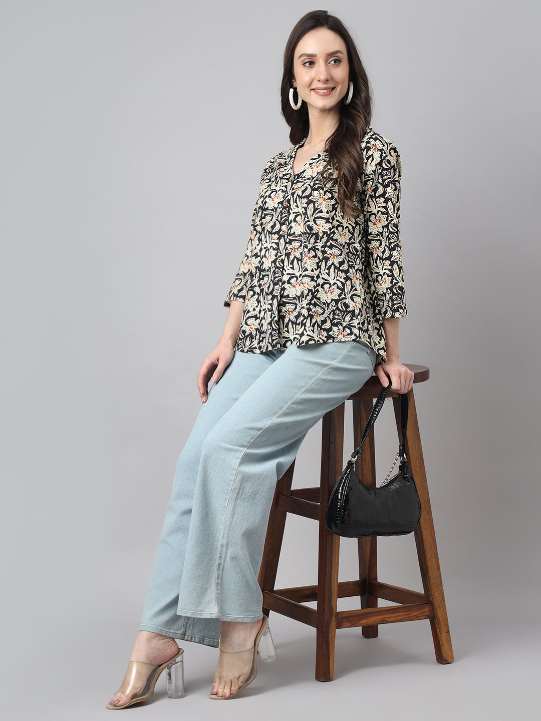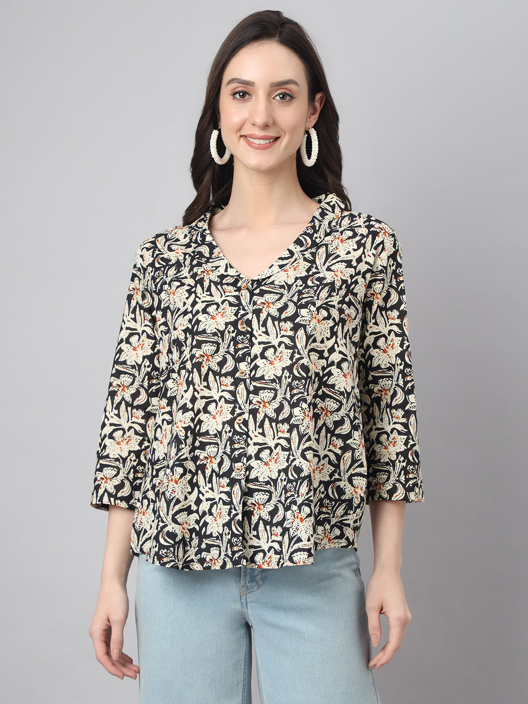 - This Black Cotton Floral Print Regular Top By Is Crafted In Cotton Fabric Featuring V Neck With Button And Placket, 3/4 Sleeves, All Over Floral Prints With Regular Fit.