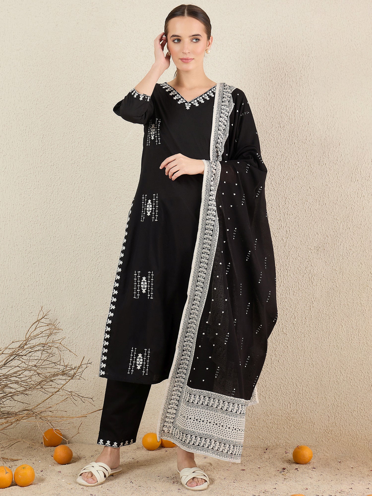 Black Embroidered Pure Cotton Straight Kurta Sets With Dupatta
