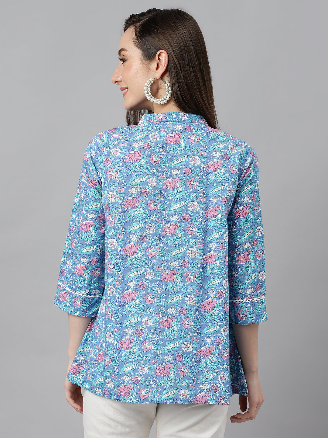 Feel Effortlessly Feminine In This Charming Blue Cotton Top. Designed In A Flattering Empire Style, It Accentuates Your Waistline While Providing Comfort And Ease. The Delicate Floral Print Adds A Touch Of Romance, Making It Perfect For Both Casual And Dressed Up Occasions. The Quarter Sleeves Offer A Balance Of Coverage And Style. Pair It With Jeans, Skirts, Or High Waisted Bottoms For A Versatile Look.