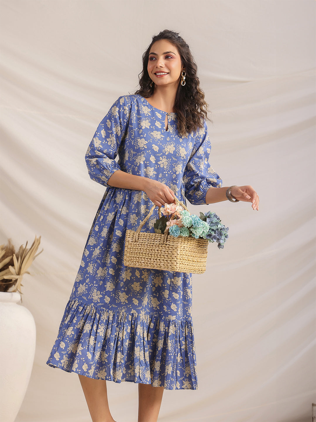 - Dress Length: 46(in) | Colour: Blue | Pattern: Floral | Occasion: Casual | Style: Fit & Flare | Sleeve Type: Three Quarter Sleeves (Balloon Sleeves )