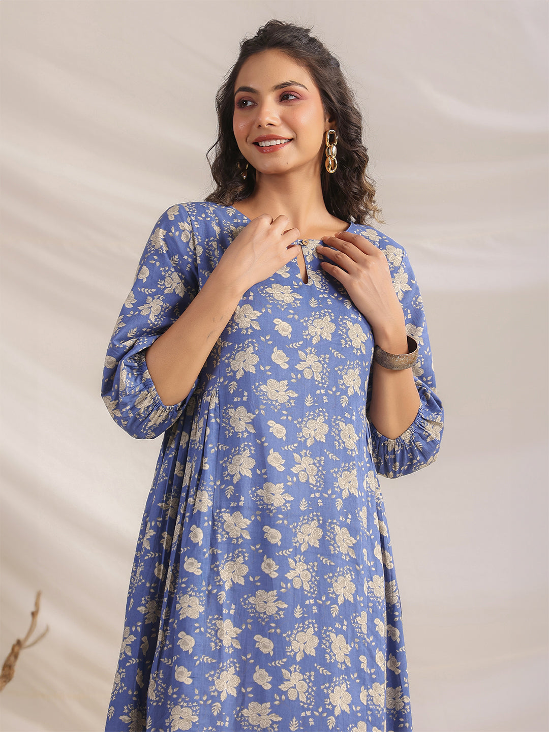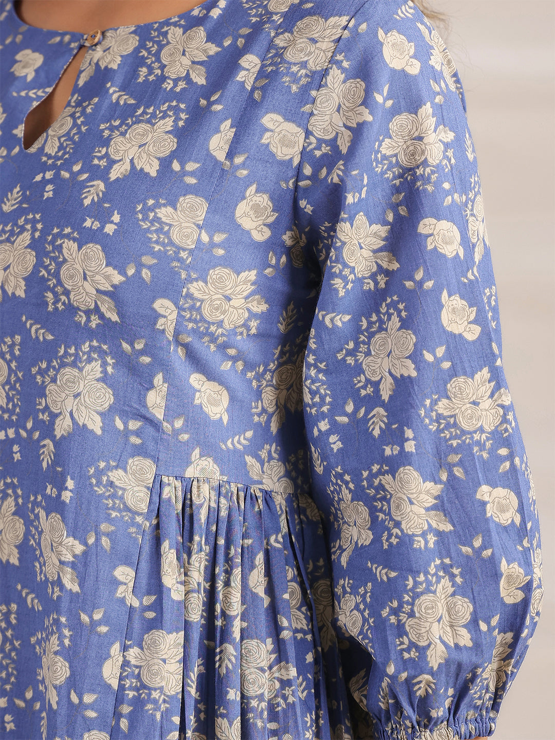 - An Elegant Blue Cotton Floral Fit & Flare Dress From Is A Captivating Piece For Your Wardrobe. Adorned With A Beautiful Floral Pattern, This Dress Exudes Charm And Grace. The Keyhole Neckline Adds An Alluring Touch, While The Balloon Sleeves Lend A Sense Of Whimsy And Elegance. Featuring A Button And Loop Closure For Ease Of Wear, The Dress Is Gathered At The Waist With Tie Up Details, Enhancing Your Silhouette With A Flattering Fit. Perfect For Any Occasion, From Brunch Dates To Garden Parties, This Dress Promises To Enchant With Its Timeless Beauty And Effortless Style.