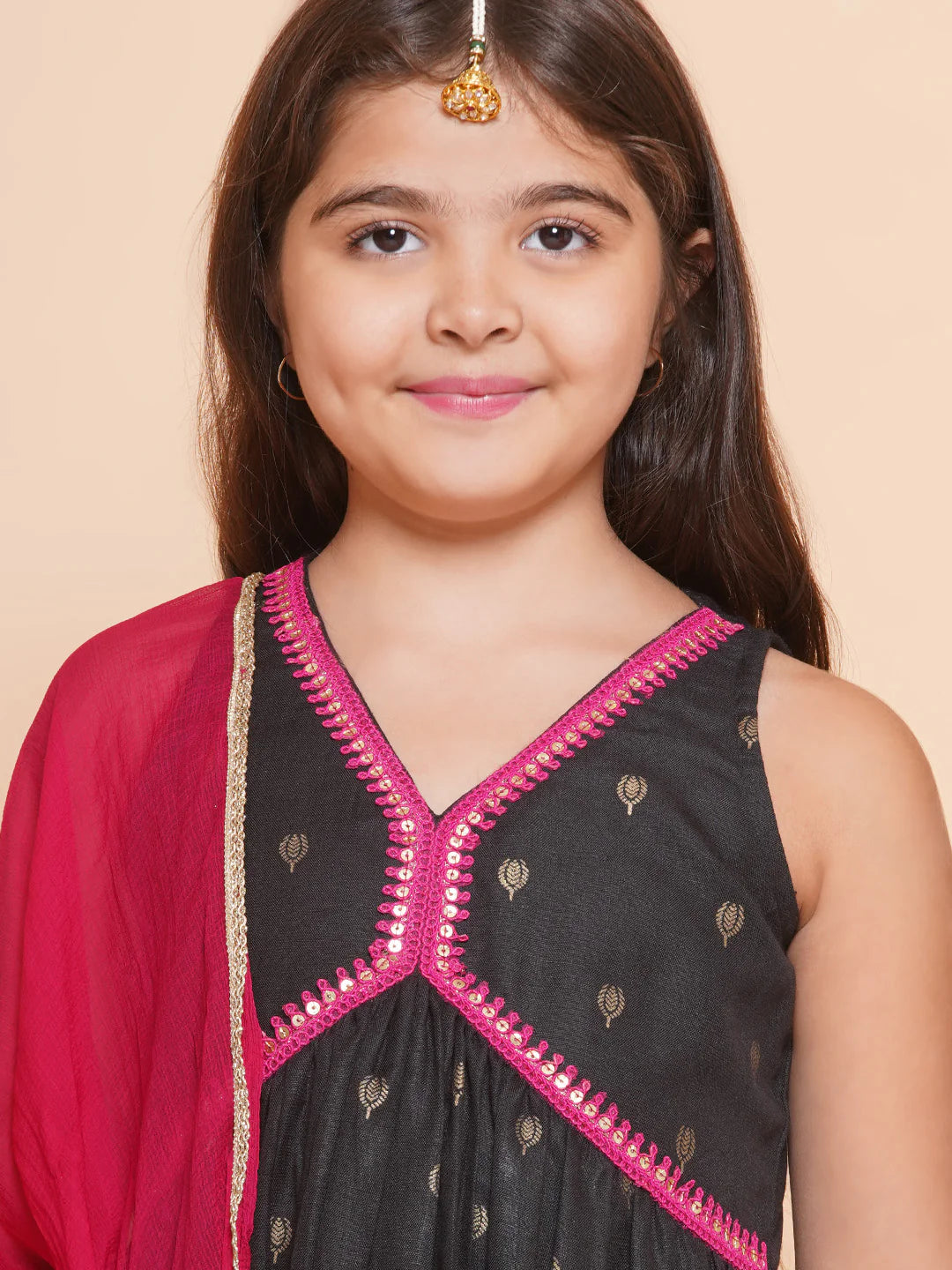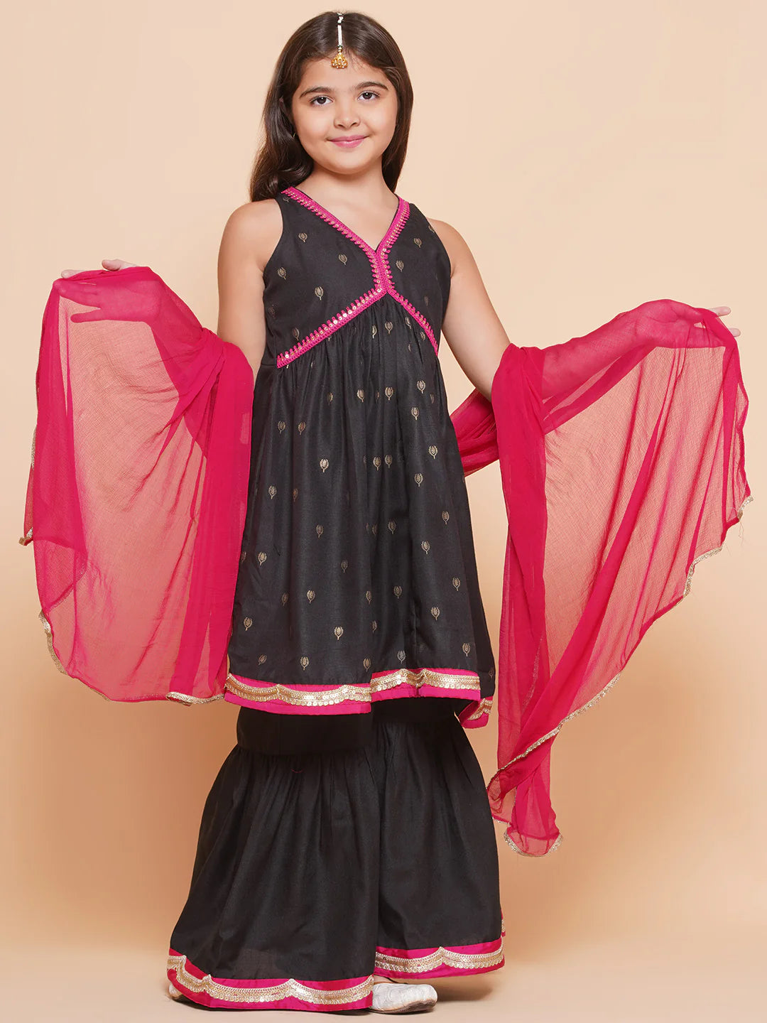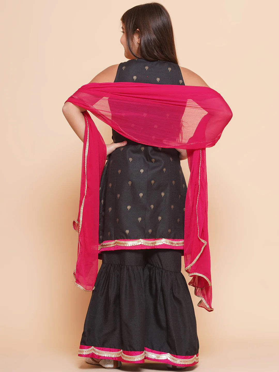 Girls Black Gold Ethnic motifs Printed Alia Design Kurta With Sharara & Dupatta
