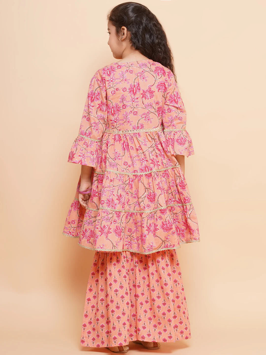 Girls Peach Printed V- Neck Kurta with Sharara