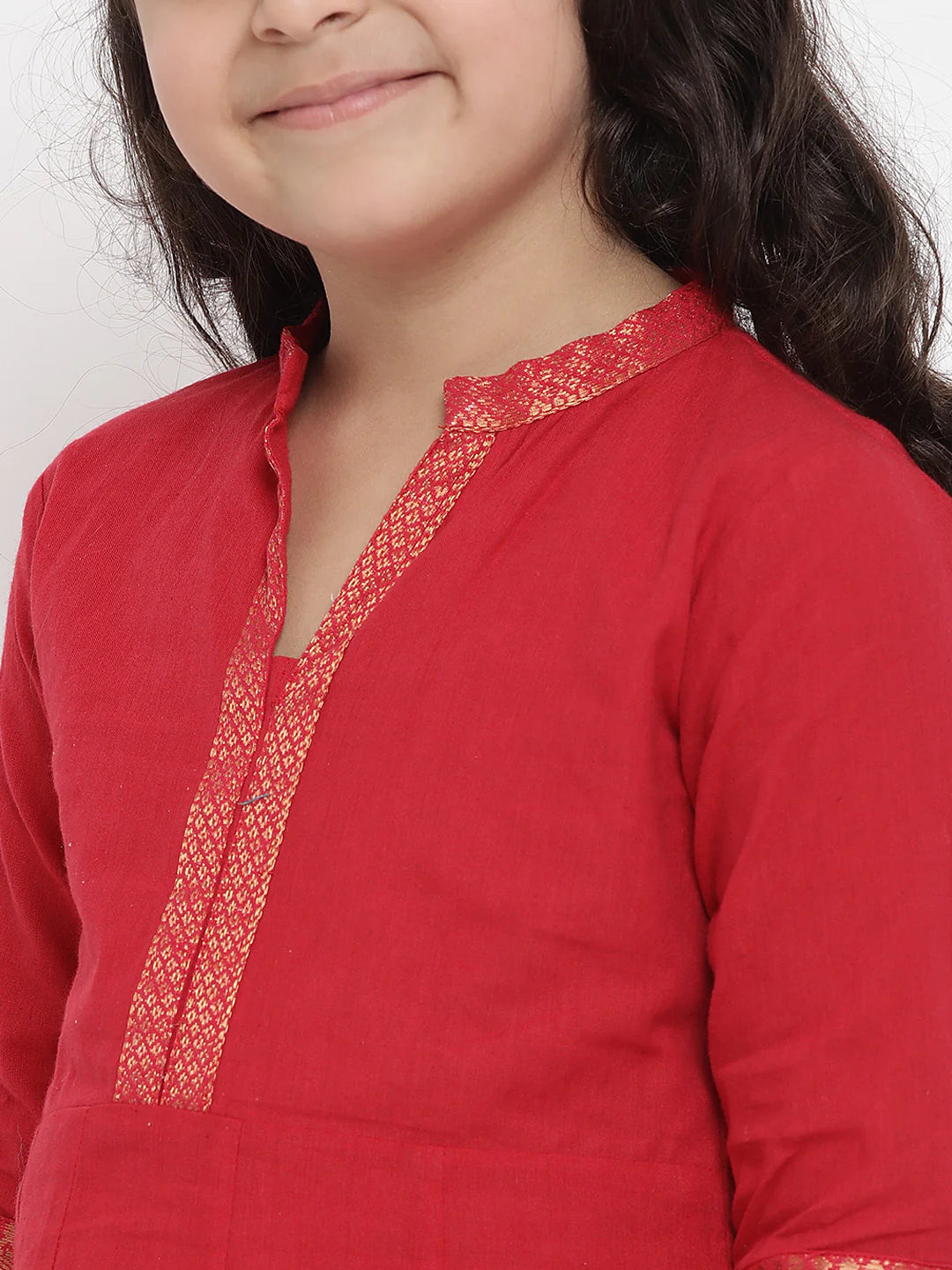 Red self design anarkali calf length kurta, has a mandarin collar, three-quarter sleeves, flared hem with Solid Elasticated waistband Palazzos