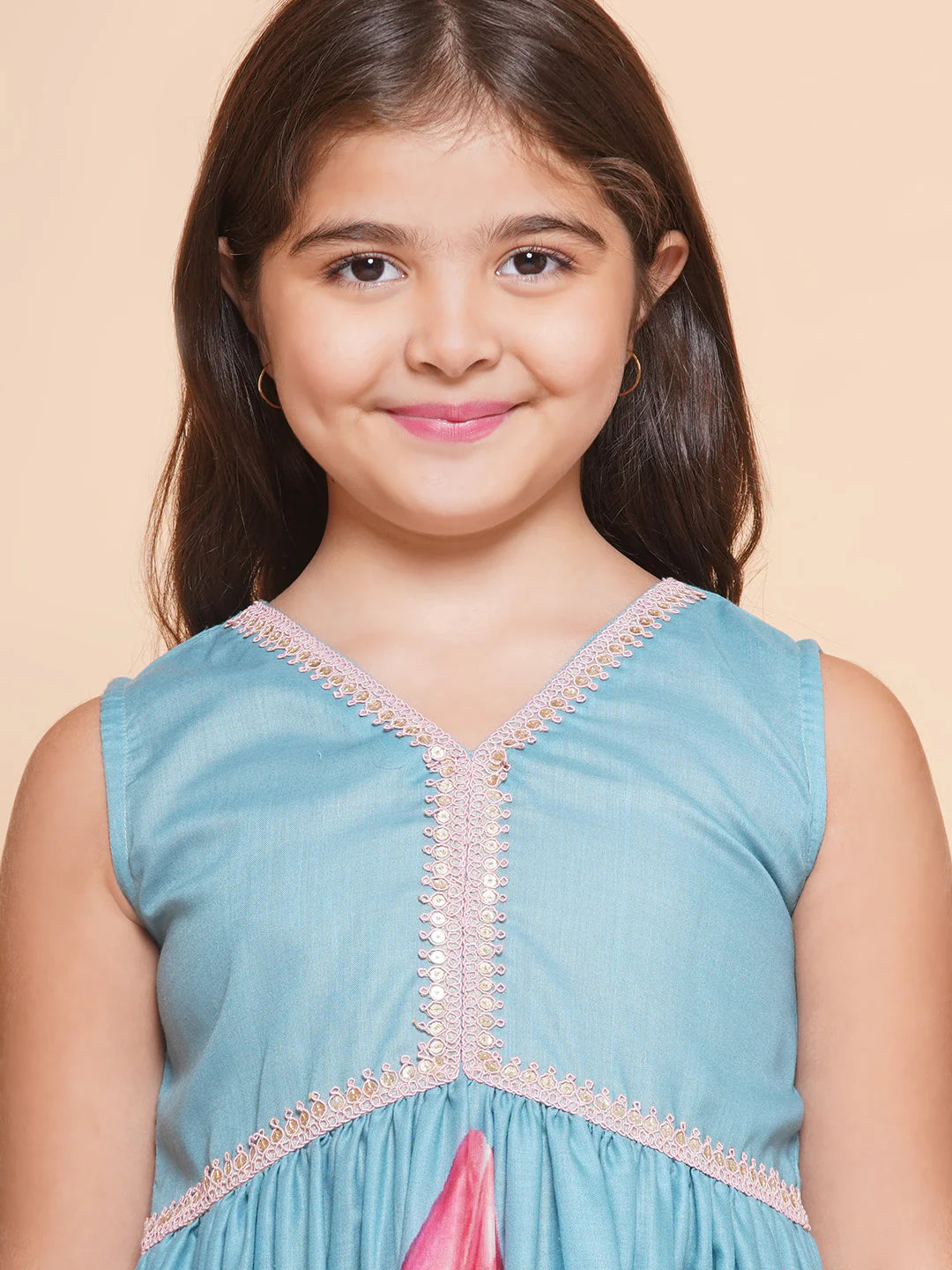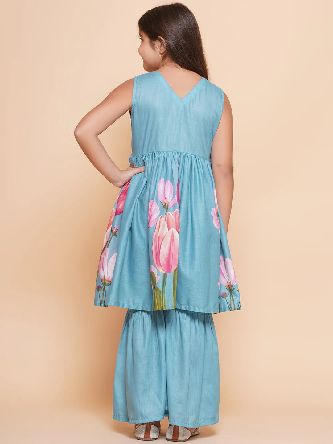 Turquoise blue Floral Printed Alia Design Kurta has a V- Neck, sleeveless Knee length with flared hem with Elasticated waistband Sharara.