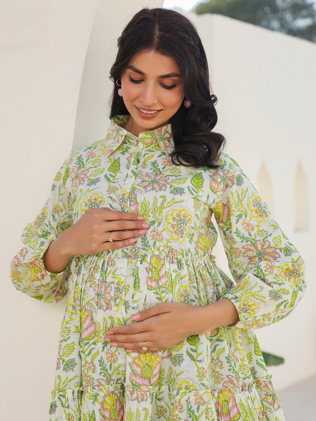 - This Green Pure Cotton Floral Printed A Line Maternity Tunic Is A Blend Of Comfort And Charm. Adorned With Multicolored Floral Prints, It Features A Shirt Collar And A Front Button Closure For A Feeding Friendly Design. The Gathers Under The Bust, Combined With Its Tiered Silhouette, Provide A Belly Friendly Fit That Grows With You Throughout Your Pregnancy. Perfect For Every Mum To Be, Both During And After, This Tunic Pairs Effortlessly With Your Favourite Bottoms For A Stylish Yet Practical Look.