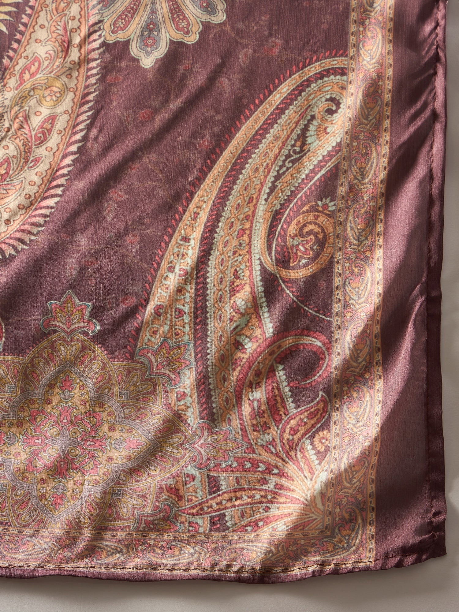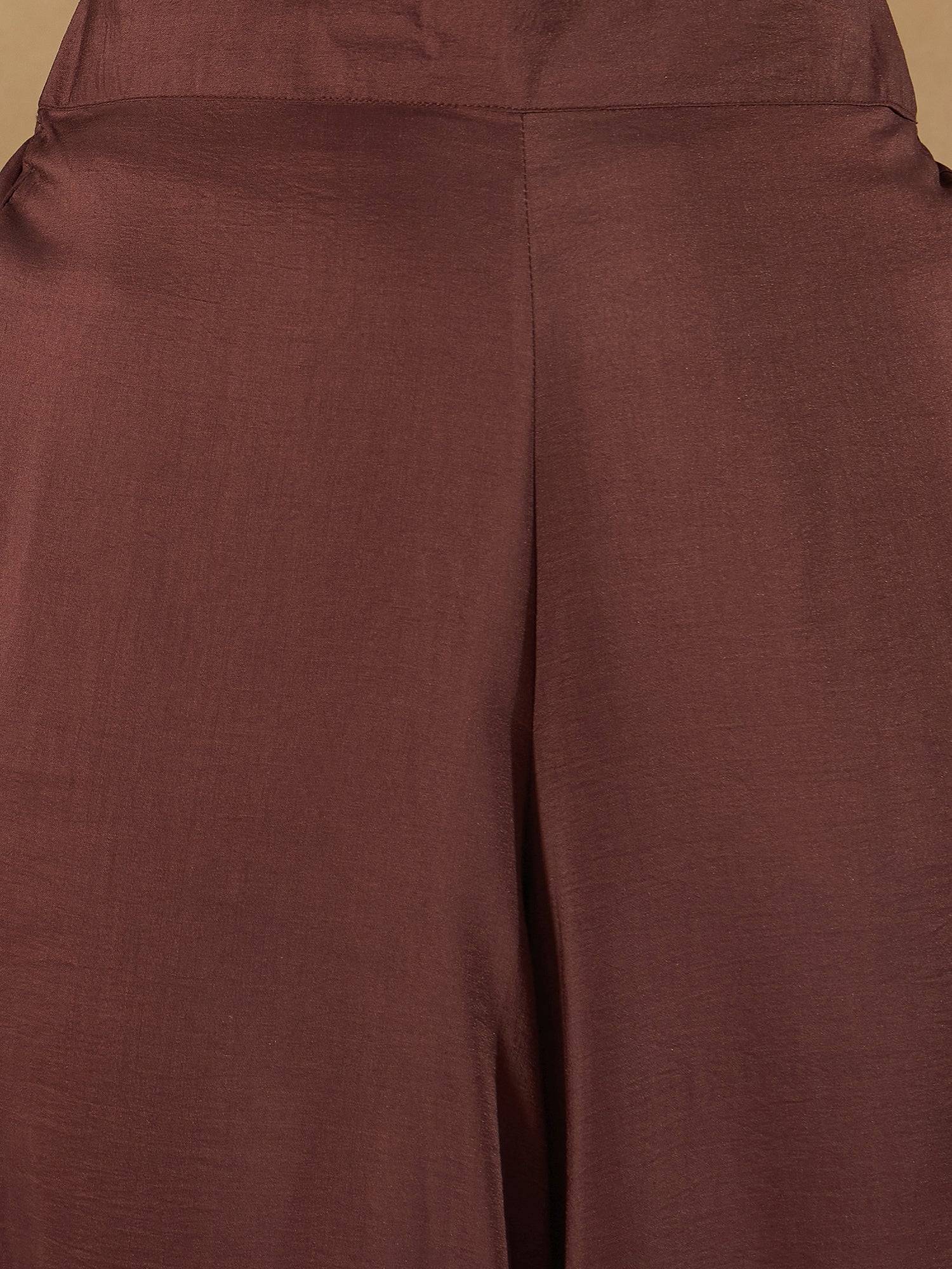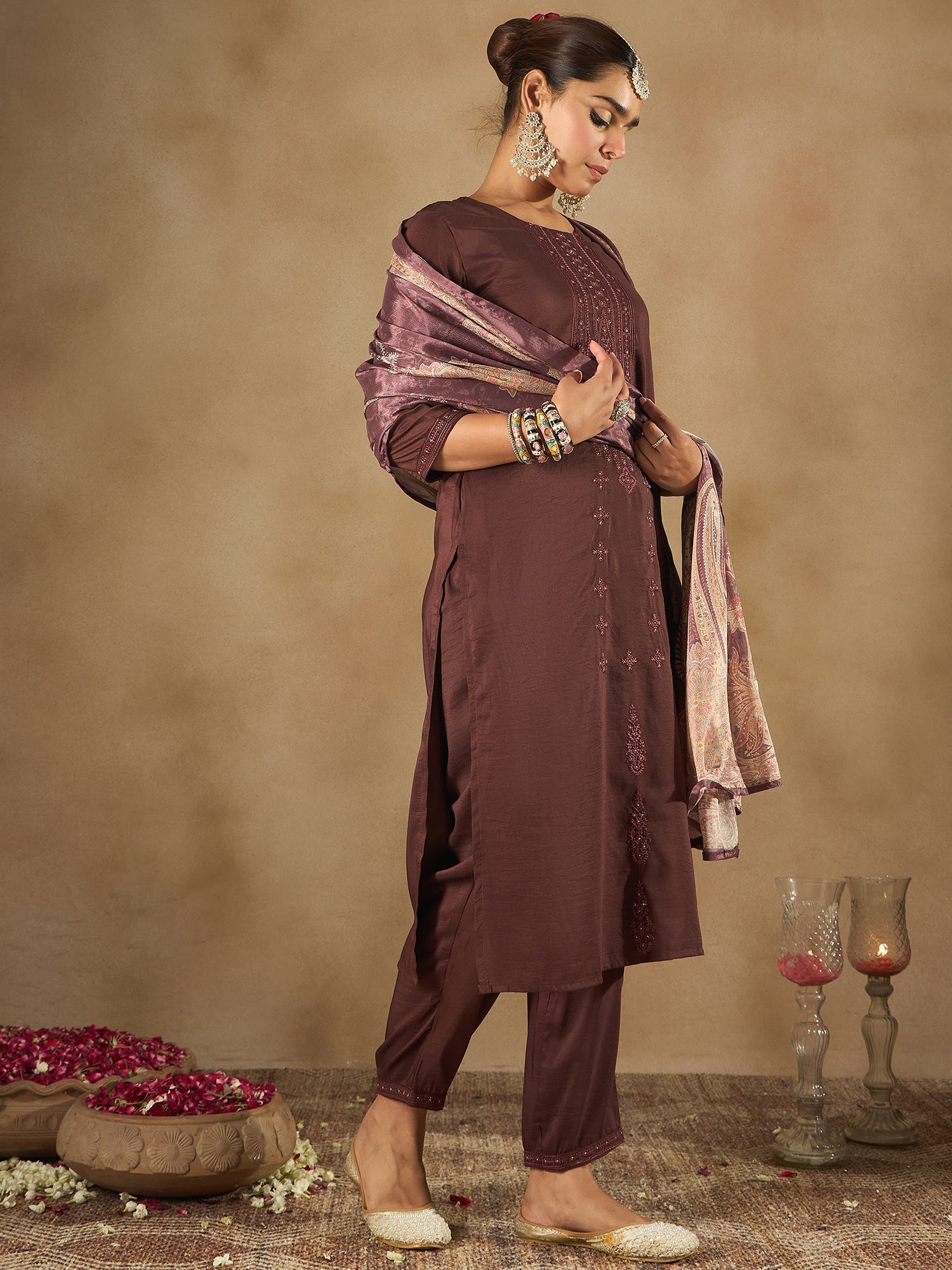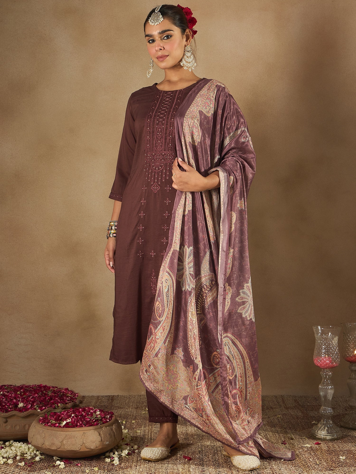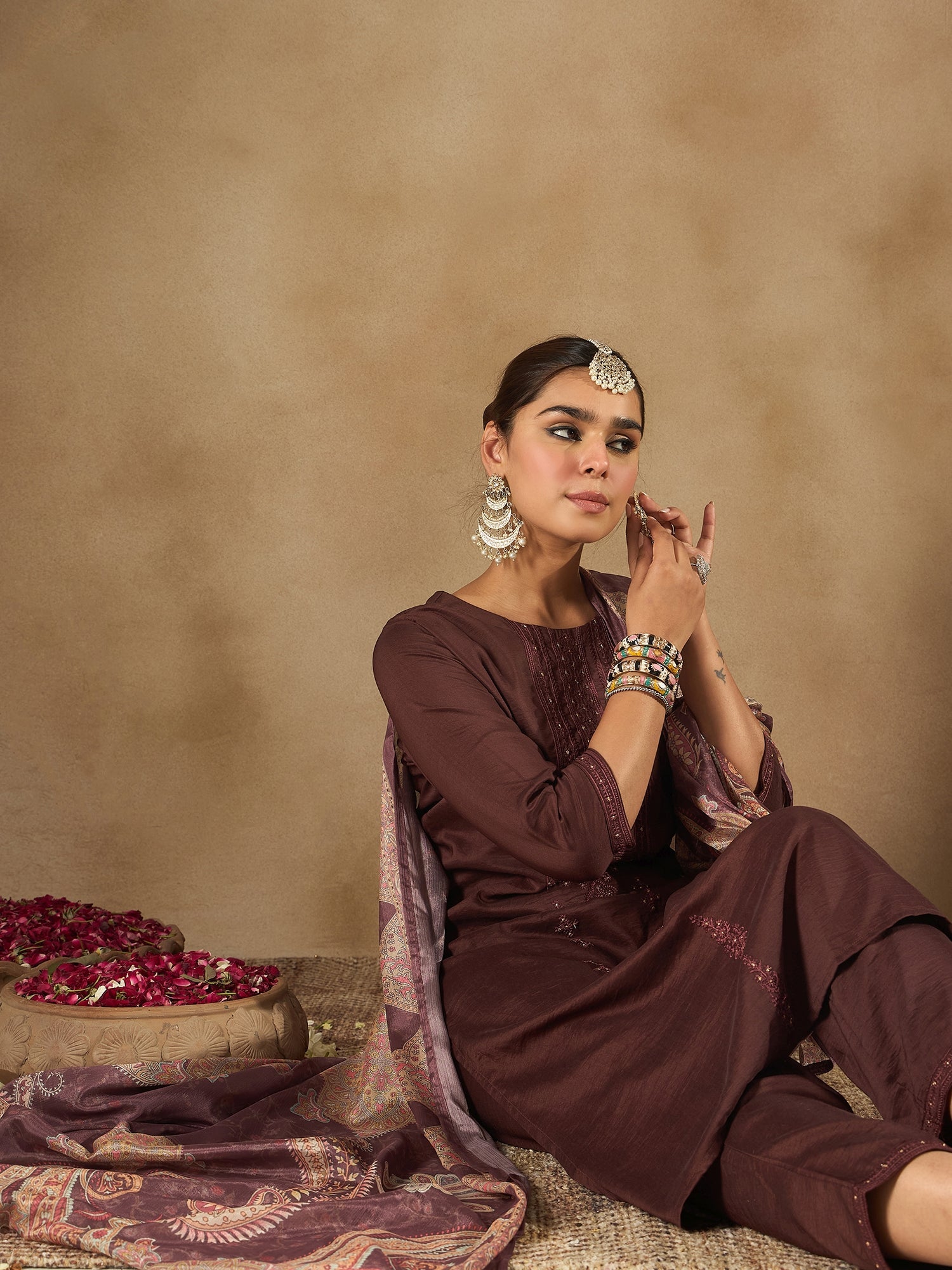 Indo Era Burgundy Embroidered Straight Kurta Trousers With Dupatta set