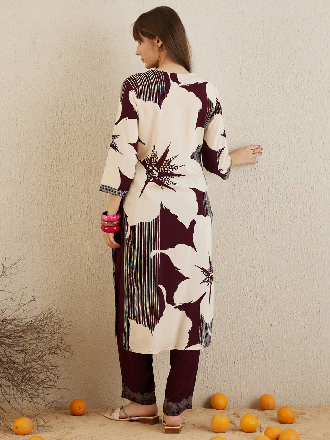 Indo Era Burgundy Printed A-Line Kurta Trousers set