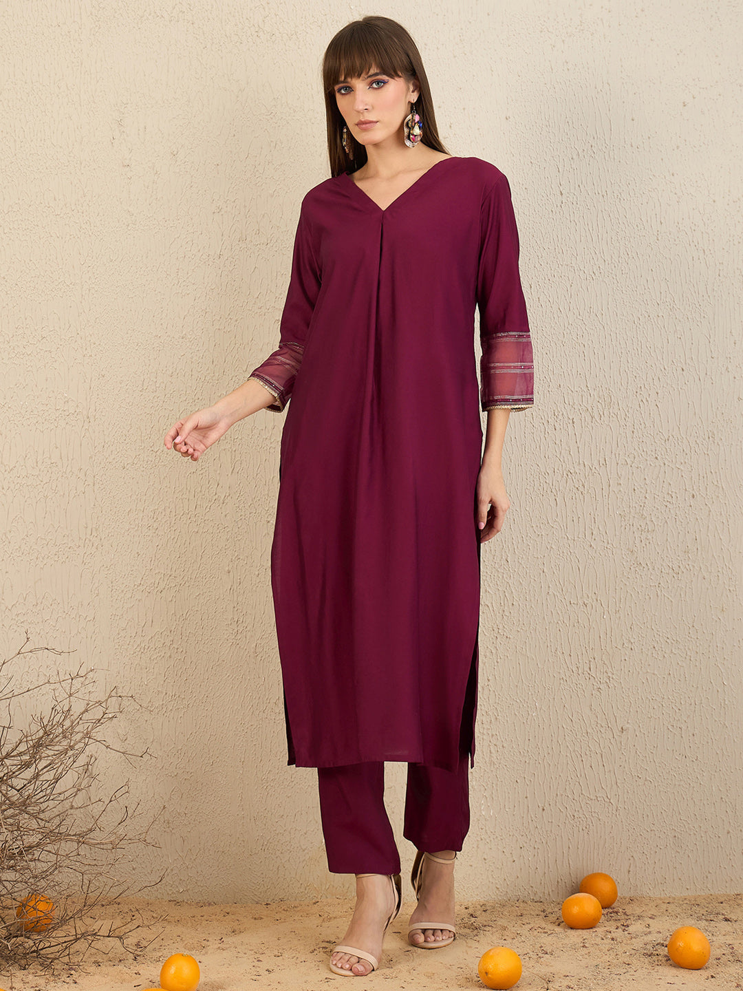 Indo Era Burgundy Self Design Straight Kurta Trousers Set