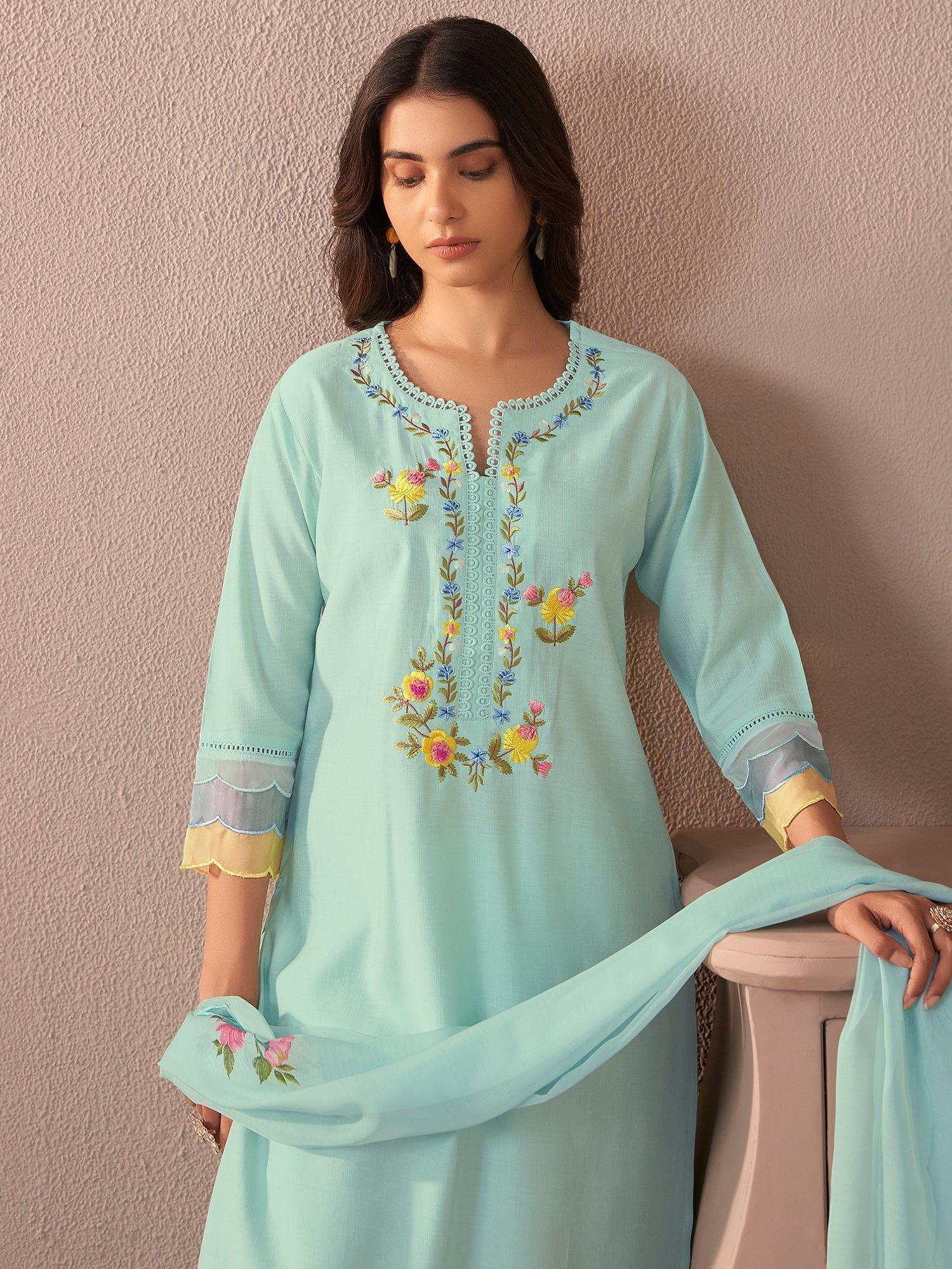 Indo Era Green Embroidered Straight Kurta Trousers With Dupatta Set