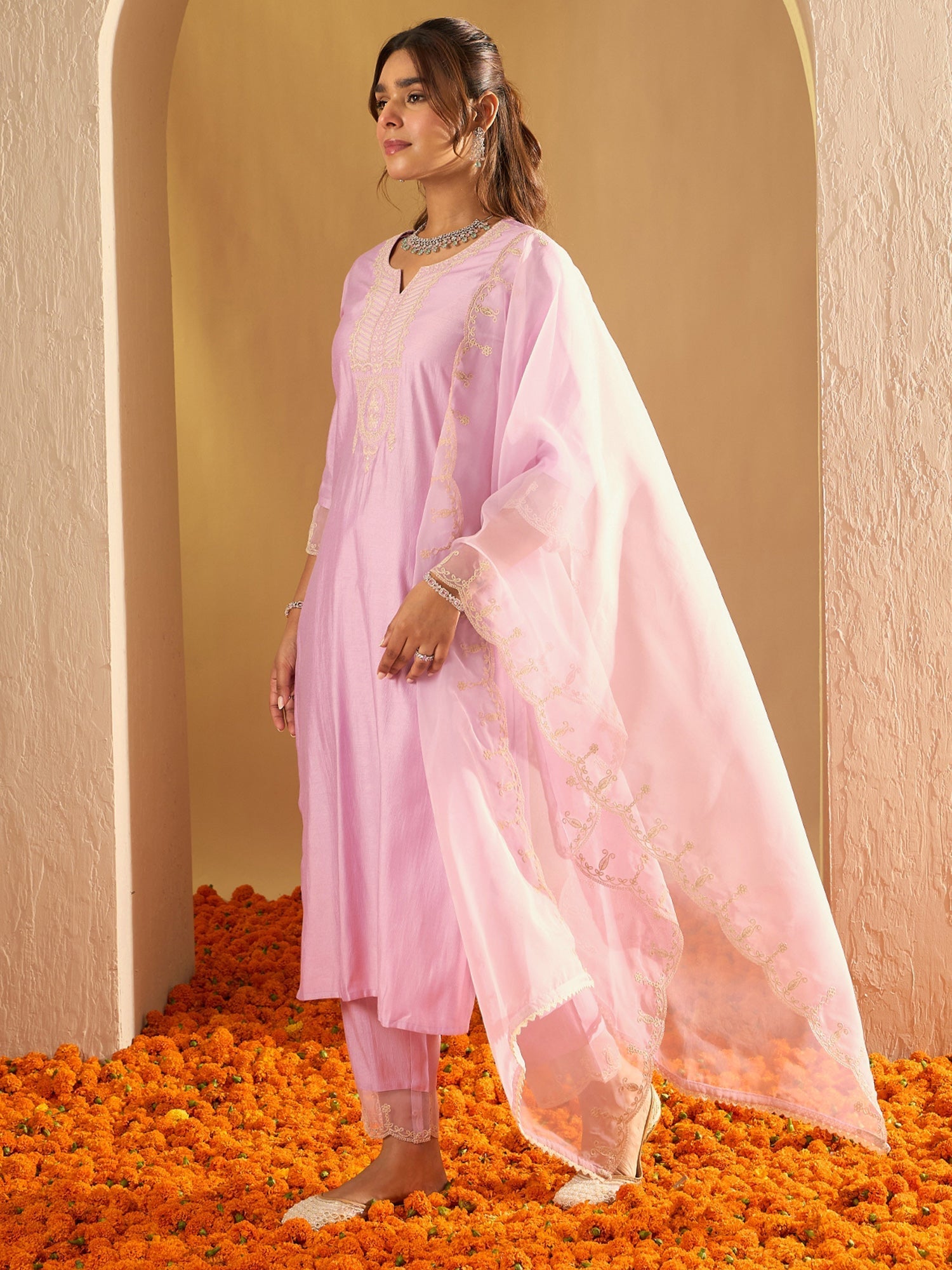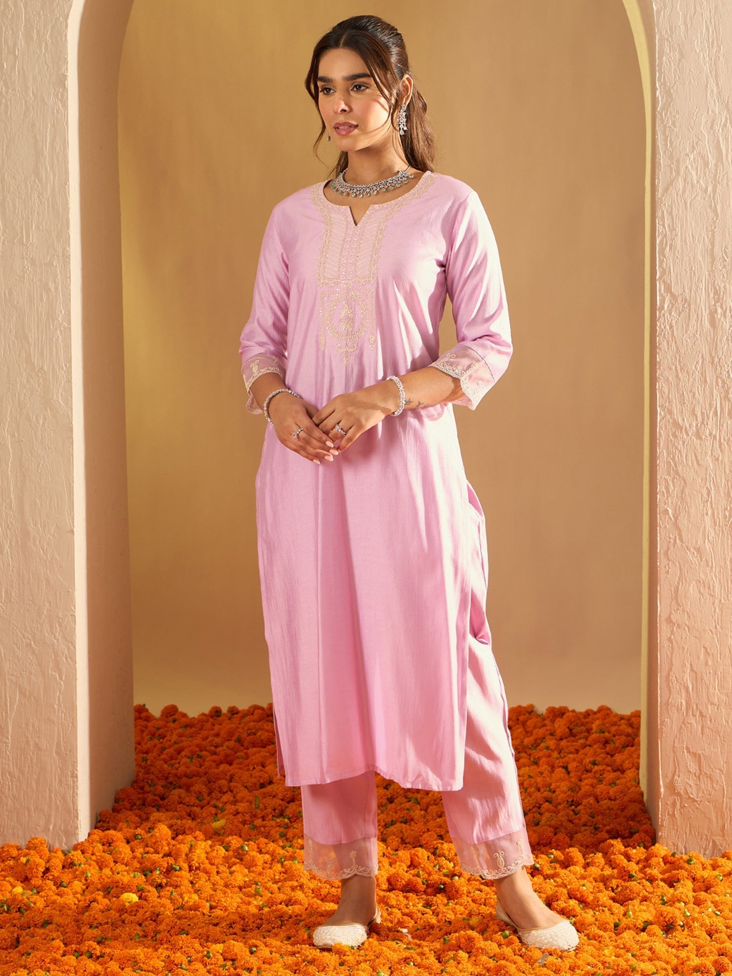 Indo Era Lavender Embroidered Straight Kurta Trousers With Dupatta Set