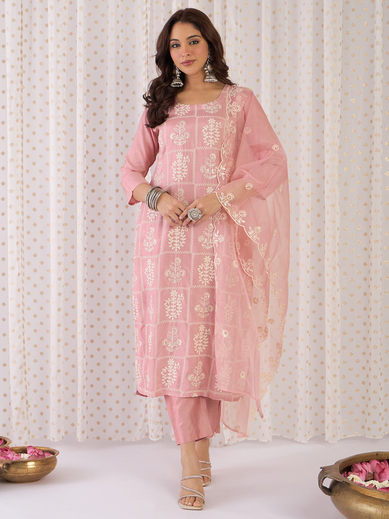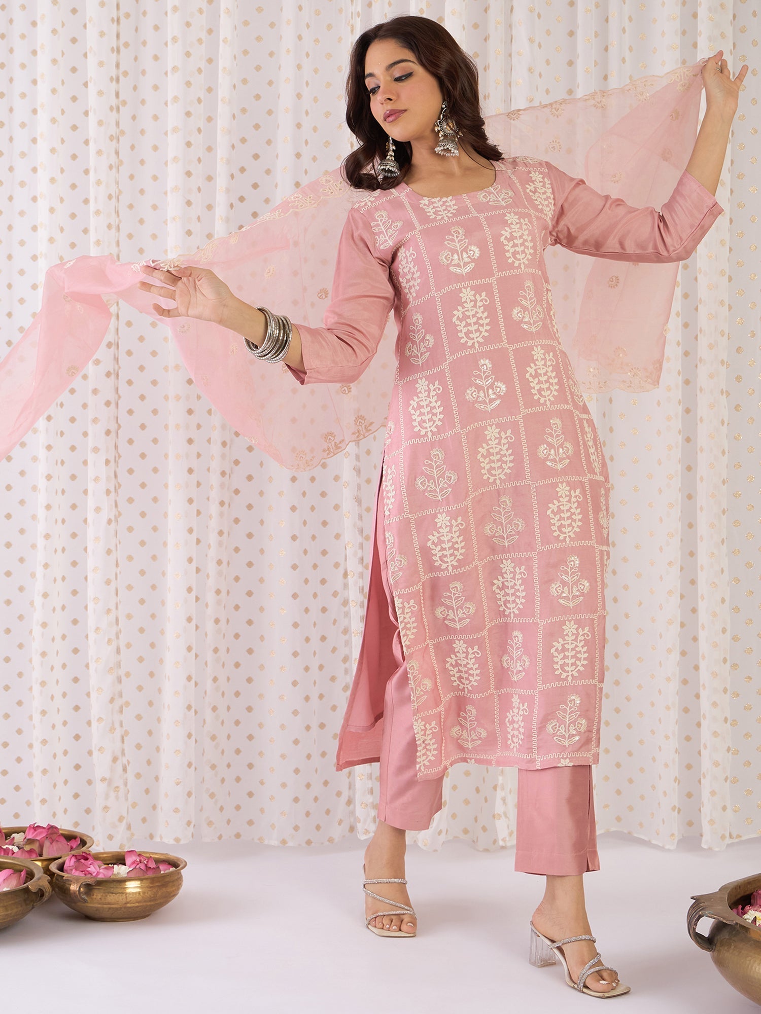 Mauve Embroidered Straight Kurta Trousers With Dupatta Set
