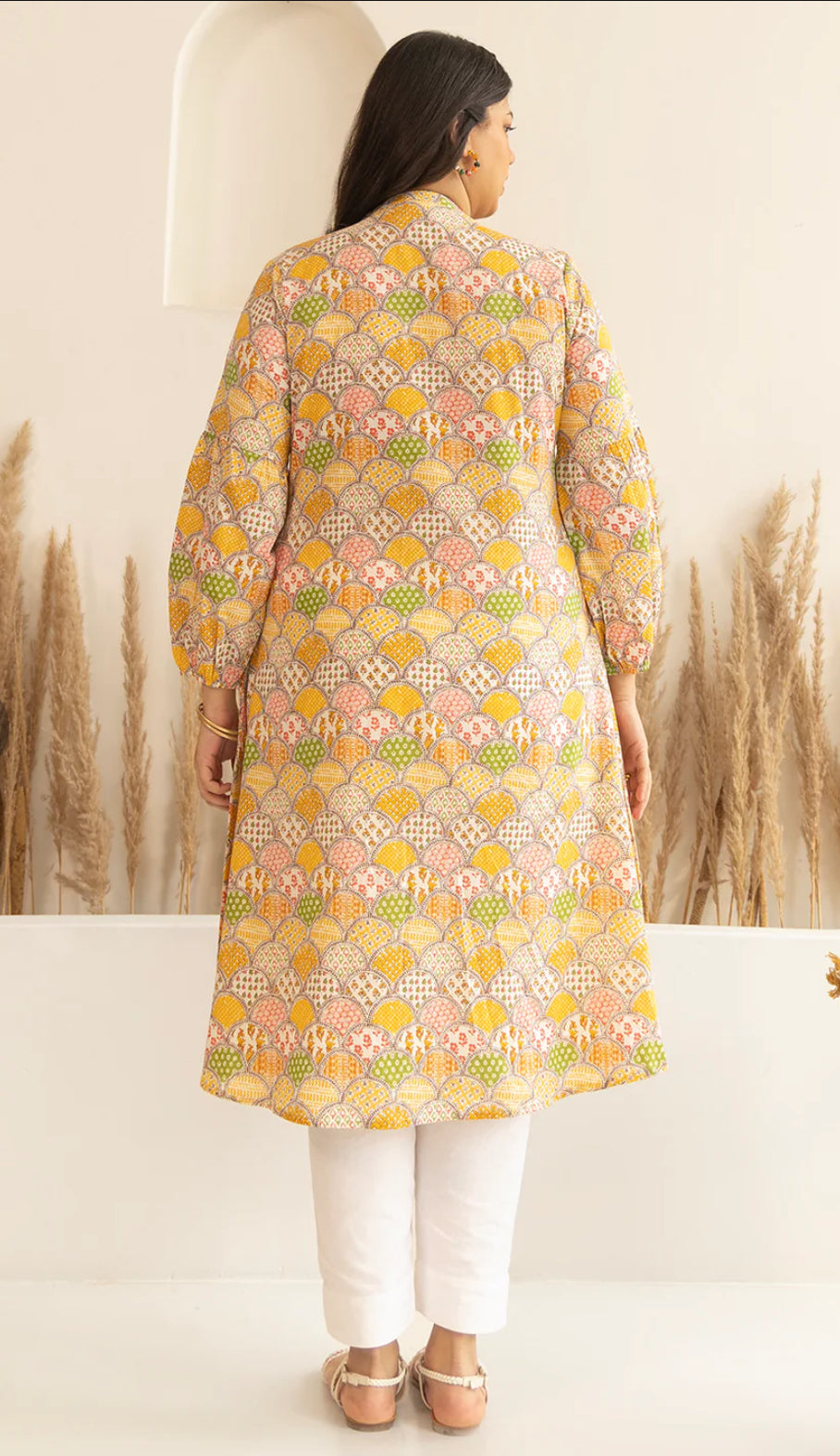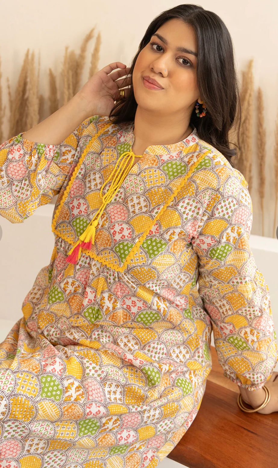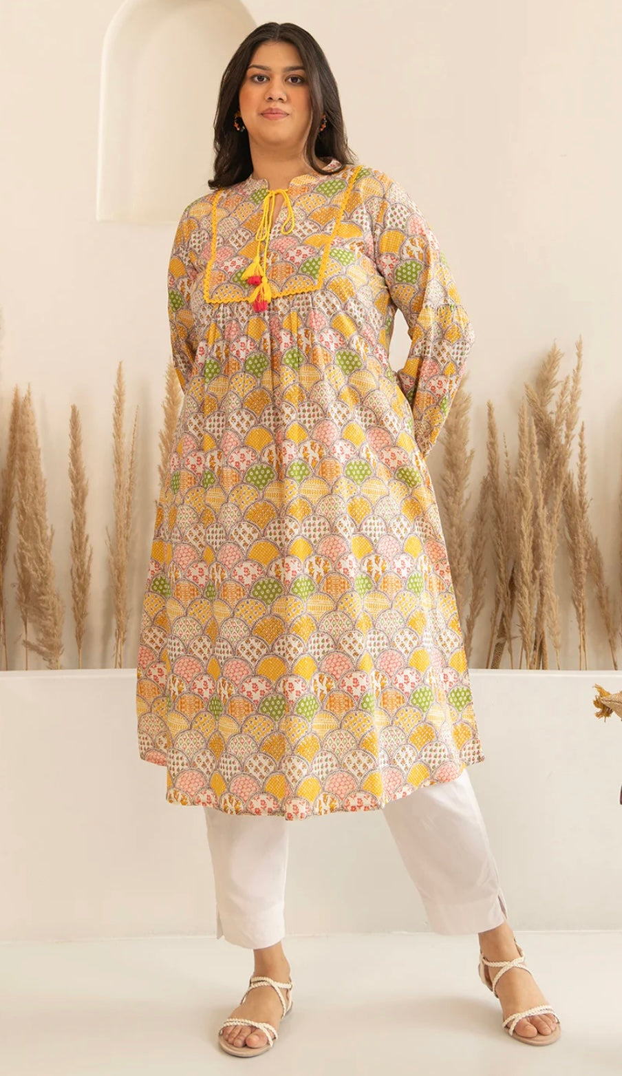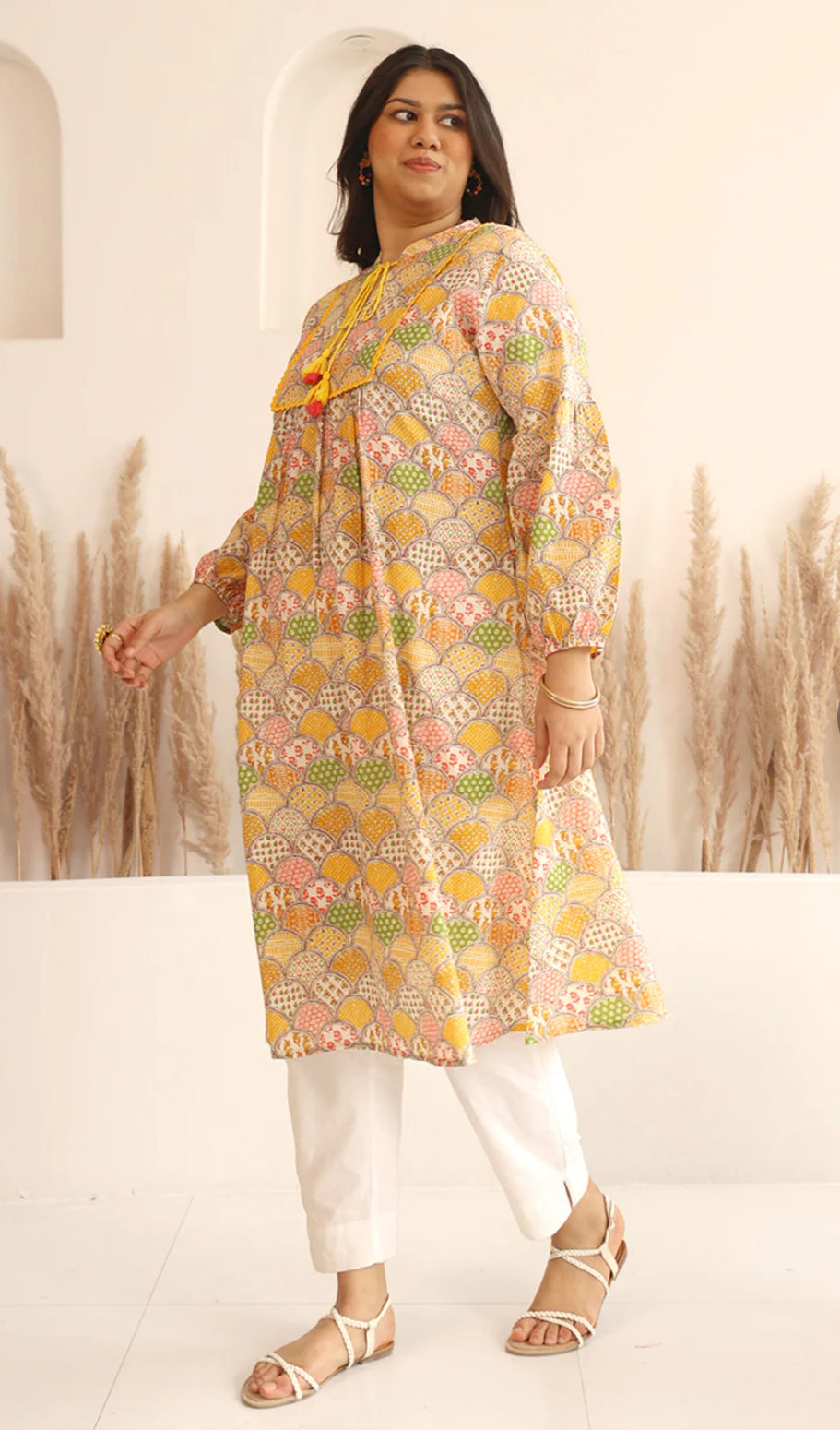 - Women's Multicolor Cotton Ethnic Motifs A-Line Kurta, a perfect blend of traditional and contemporary fashion. The kurta features exquisite Ethnic Motifs that add a touch of cultural charm, making it suitable for various casual occasions and gatherings. The A-line silhouette complements various body types, providing a flattering fit to women of all sizes. Designed with a mandarin collar, this kurta exudes sophistication and grace. The 44" calf length enhances its traditional appeal while offering a modest and classy look. The bishop sleeves provide a voluminous and fashionable look, adding a touch of drama to the overall outfit.
