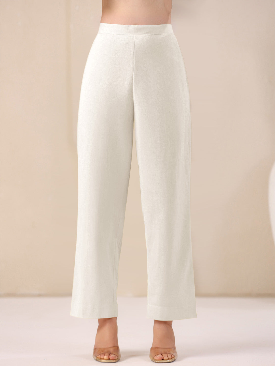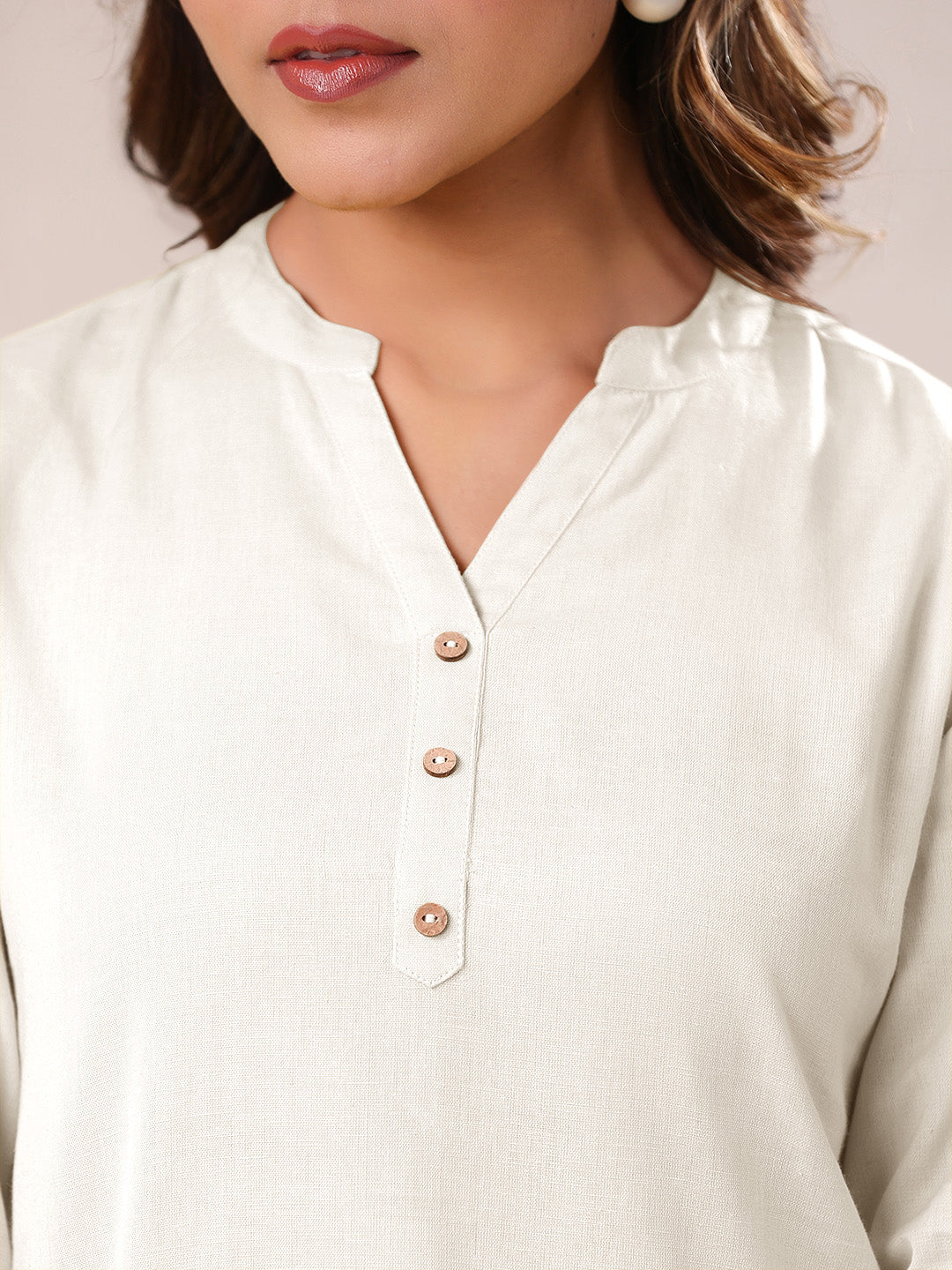 - Elevate Your Casual Wardrobe With This White Flex Cotton Solid A Line Co Ord Set. The Top Features A Chic Notch Neck With Button Ornamentation, Adding A Subtle Touch Of Elegance. Designed In An A Line Silhouette, It Ensures A Comfortable And Flattering Fit, While The Side Pocket Adds A Practical Element. Paired With Matching Elasticated Straight Pants, This Ensemble Perfectly Balances Style And Ease. Ideal For Everyday Wear, This Co Ord Set Brings Effortless Sophistication To Your Look.