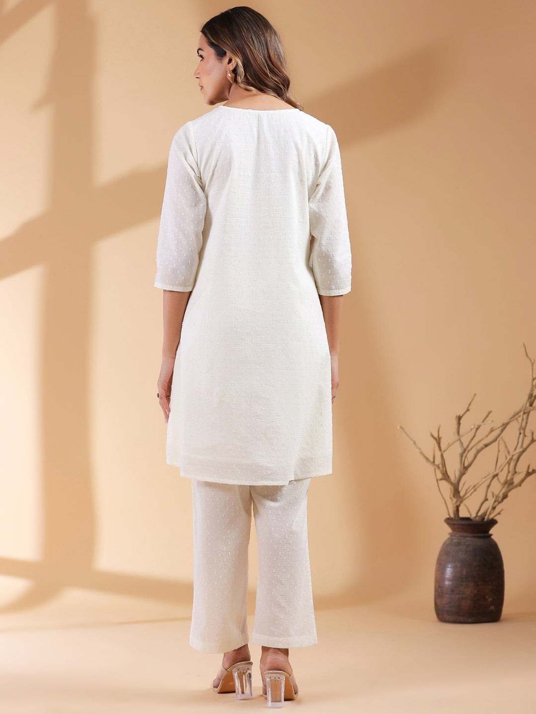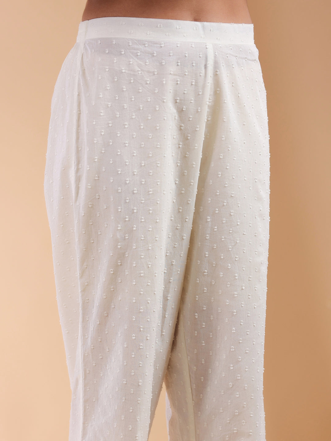 - This Off White Dobby Cotton A Line Co Ord Set Is The Perfect Blend Of Elegance And Ease. The Kurta Features A Flattering V Neck, A Flowy A Line Silhouette That Drapes Beautifully, And A Functional Side Pocket For Added Convenience. Paired With Matching Straight Pants, This Ensemble Ensures A Chic Yet Comfortable Look. Both Pieces Are Lined With Soft Mull, Making It An Ideal Choice For All Day Wear.