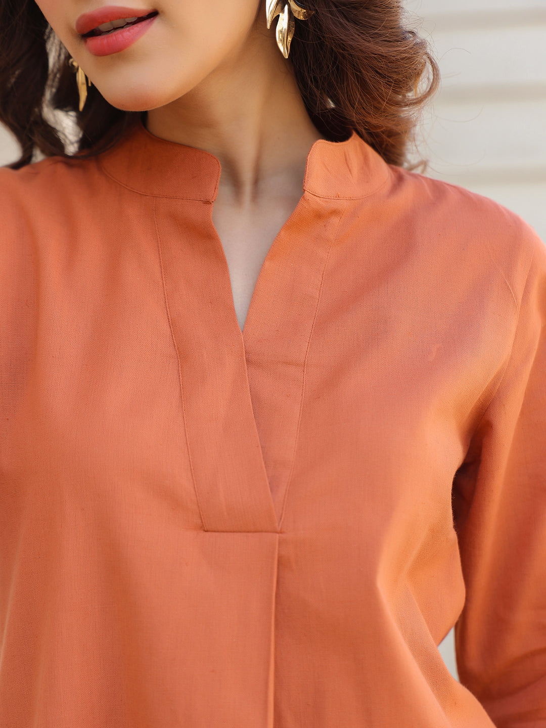 - This Rust Flex Cotton A Line Co Ord Set Is The Model Of Effortless Style. The Top Features A Sleek Band Collar With A V Neck And A Single Pleat Under The Yoke, Offering A Refined Yet Relaxed Look. With A Side Pocket, This Set Combines Simplicity With Class. The Matching Straight Pants Complete The Ensemble, Making It Perfect For Casual Outings. Versatile And Comfortable, This Co Ord Set Is A Must Have Addition To Your Wardrobe.