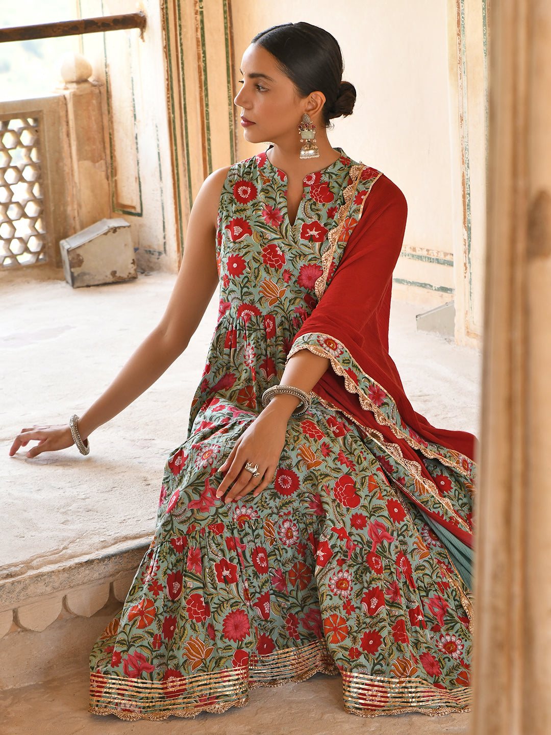 - Add Spark To Your Occasions With This Sage Green Green Flared Cotton Printed Kurta And Pant Set With A Dual Toned Chiffon Dupatta. The Kurta Comes With All Over Prints, Sleeveless, Mandarin Collar, Flared Silhouette With Gota Detailing. It Comes With Maroon Solid Cotton Pants Featuring An Elasticated Waist, Paired With An Ombre Dual Tone Sea Green And Maroon Dupatta With Gota Detailing At The Borders.