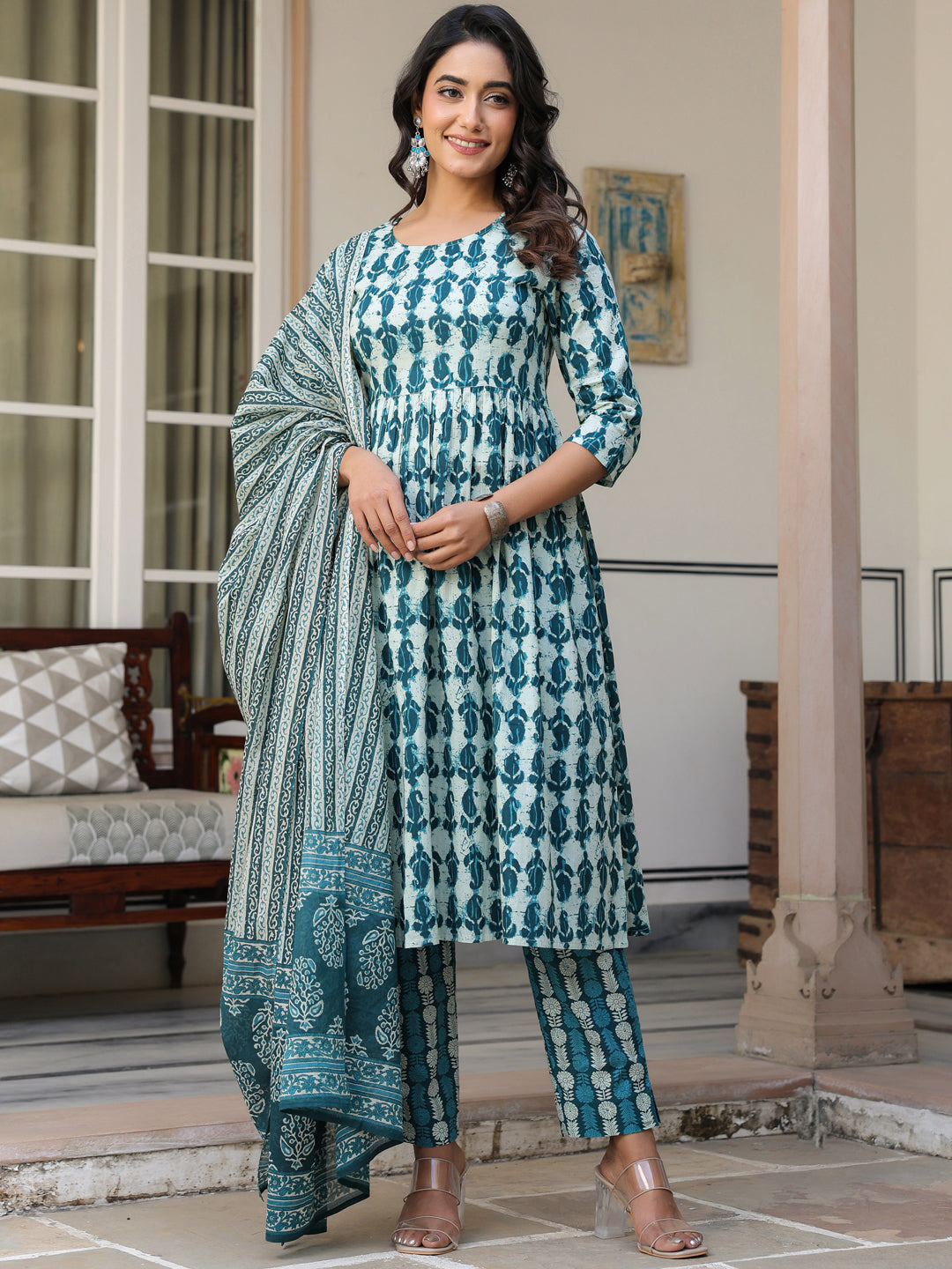 Teal Blue Pure Cotton Abstract A-line Kurta Set