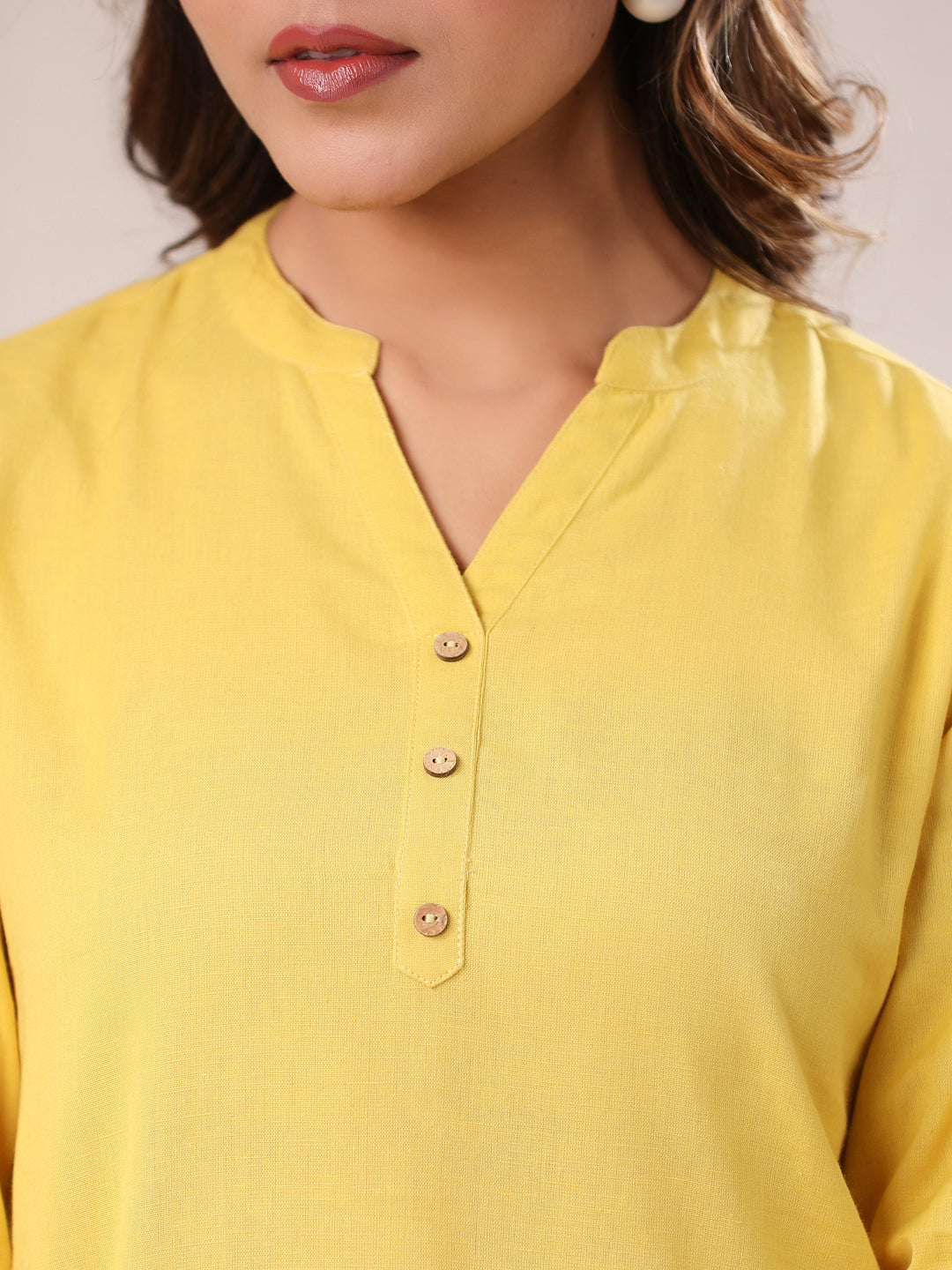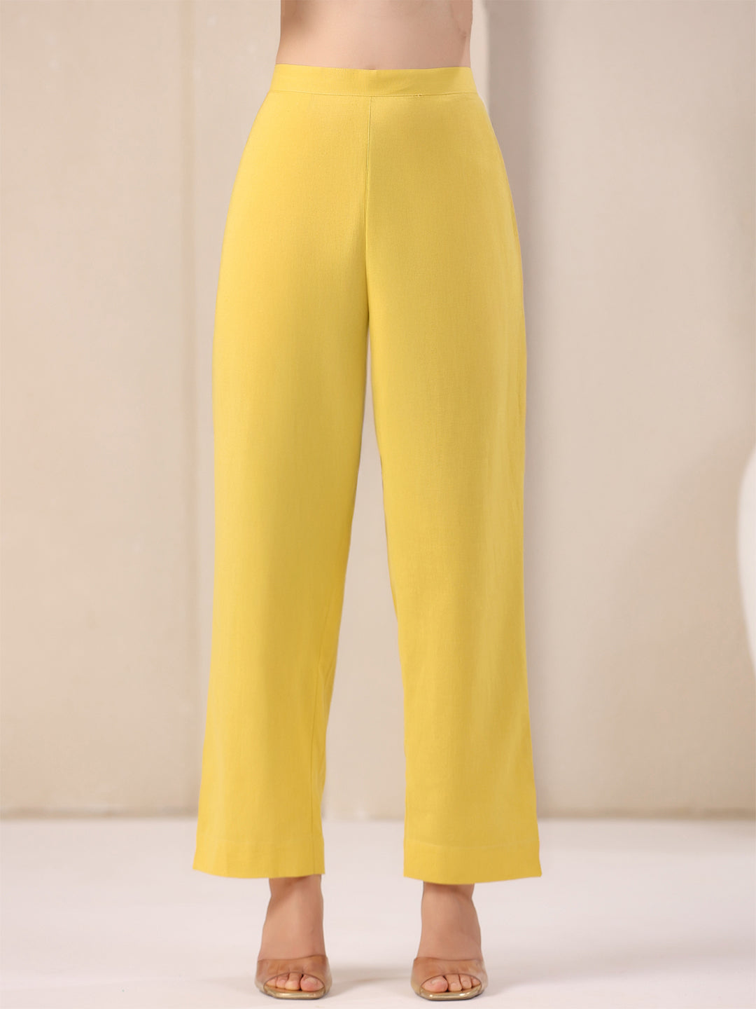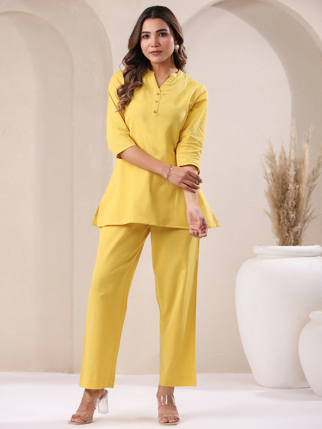 - Elevate Your Casual Wardrobe With This Yellow Flex Cotton Solid A Line Co Ord Set. The Top Features A Chic Notch Neck With Button Ornamentation, Adding A Subtle Touch Of Elegance. Designed In An A Line Silhouette, It Ensures A Comfortable And Flattering Fit, While The Side Pocket Adds A Practical Element. Paired With Matching Elasticated Straight Pants, This Ensemble Perfectly Balances Style And Ease. Ideal For Everyday Wear, This Co Ord Set Brings Effortless Sophistication To Your Look.